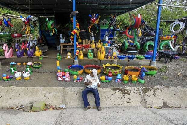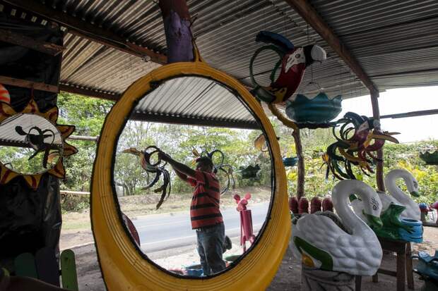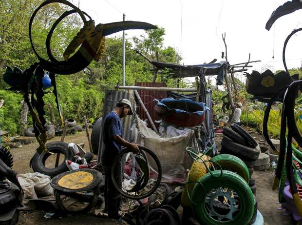 19-летний студент Хосуэ Салазар собирает старые шины на муниципальной свалке г. Масая в Никарагуа. Он делает из них красочных птиц, столики, цветники и другие предметы интерьера, которые продает в своем магазинчике, расположенном на Панамериканских шоссе.