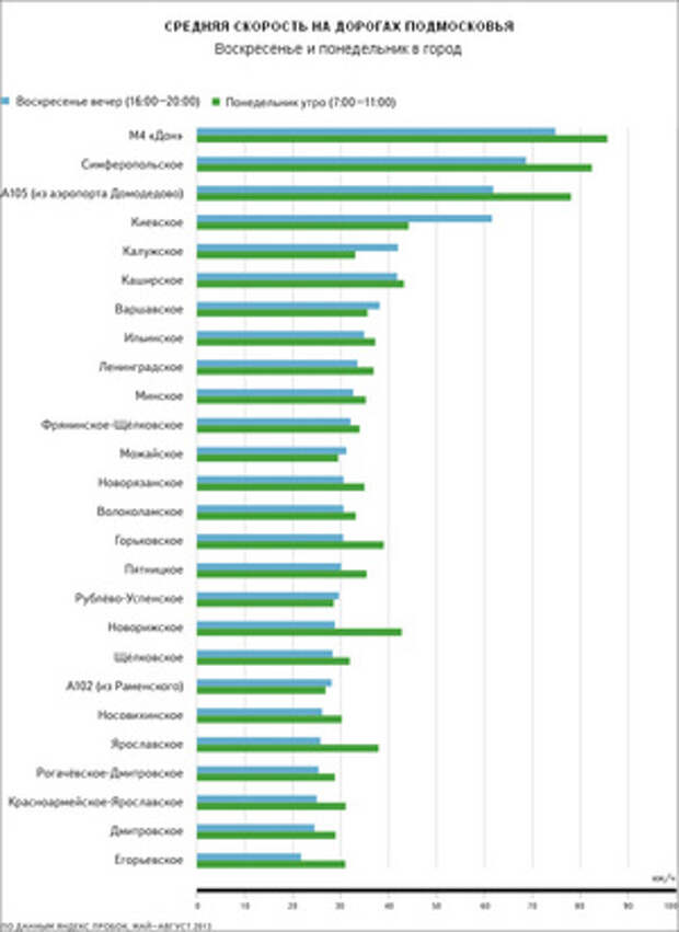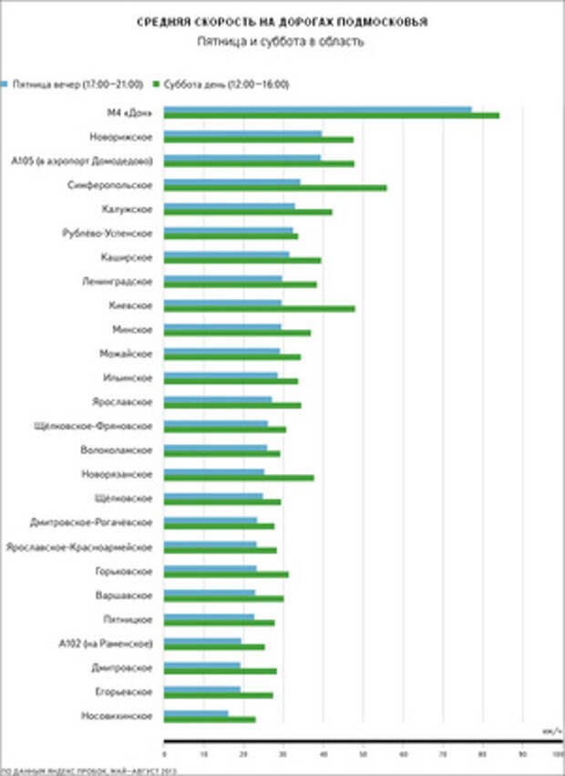 Согласно отчету аналитического центра, больше всего повезло тем автомобилистам, у которых дача находится по трассе М4 «Дон». Средняя скорость движения в пятницу вечером на автомагистрали составляет более 75 км/ч – это лучший показатель в Подмосковье. Также сравнительно быстро едут Новорижское шоссе и трасса А105 в аэропорт Домодедово (около 40 километров в час).